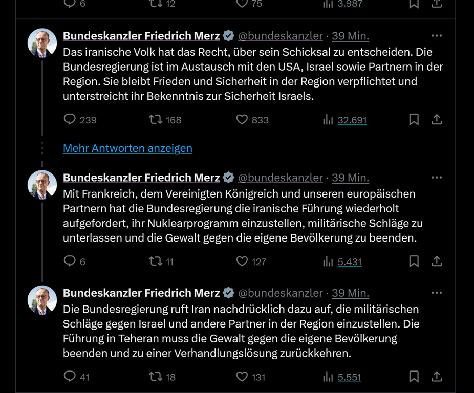 selektive Wahrnehmung selektive Wahrnehmung 28. Februar 2026 Dirk Kommentare 0 Kommentare Es gibt inzwischen Verlautbarungen auf dem x-Kanal des Bundeskanzlers. Ich hab den Eindruck, der Kanzler wurde erst Mittags wach, guckte in die Nachrichten und hat irgendwie verpaßt, wer hier wen angegriffen hat.